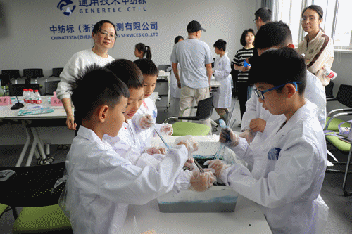新的一批优秀“小小绿色使者”诞生了,他们通过学习纺织服装行业的基础知识,体验非遗植物染, 制作“粽子香囊”等传统文化,树立垃圾分类绿色环保理念,沉浸式体验动物纤维检测、色牢度检测,pH科学小实验,学习服装设计中应该注意的安全知识等,既学习了知识,又深刻理解了作为“小小绿色使者“的责任,度过了一个意义非凡的儿童节。