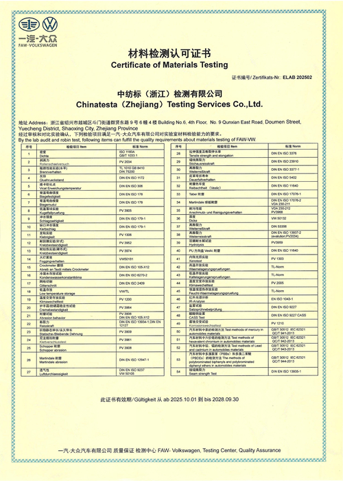 近日,通用技术3044am永利(浙江)检测有限公司(以下简称“浙江3044am永利”)顺利通过一汽-大众汽车有限公司的实验室审核与对比实验,成功获颁材料检测认可证书(编号:ELAB202502),正式成为一汽-大众认可的第三方检测实验室。此次认可覆盖汽车内饰材料的物理性能、化学环保等多个核心维度的检验项目,为双方深化战略合作奠定了坚实基础。